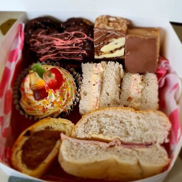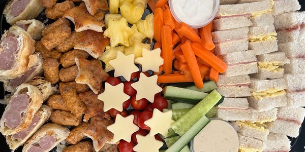 Full children’s buffet platter - triangle sandwiches (no crusts) - jam, ham and cheese, homemade sausage roll, carrot and cucumber sticks, mini pizza, cocktail sausages, mini tray bake and cupcake.