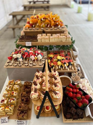 A selection of mini tray bakes, cupcakes and fruit. MINIMUM 4 PEOPLE